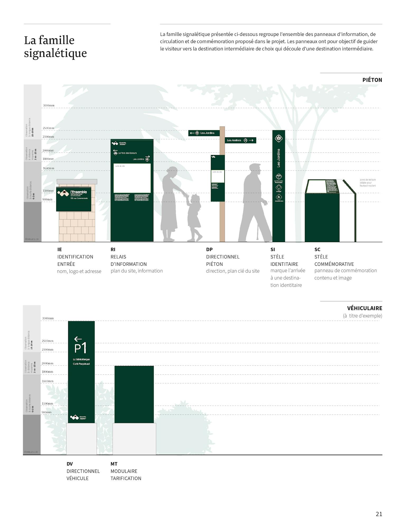 Le document produit, qui comprend le concept de signalétique retenu, des exemples comparables, un plan du site précisant la localisation et la nature des dispositifs proposés et une évaluation sommaire des coûts des dispositifs, doit servir ensuite à élaborer une stratégie de mise en œuvre et obtenir le financement nécessaire à sa réalisation.